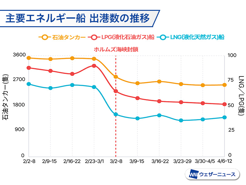 全体では、世界の石油タンカー入出港数は封鎖前の週計約3500隻から、4月第2週には約2560隻へと約27%減少しました。
