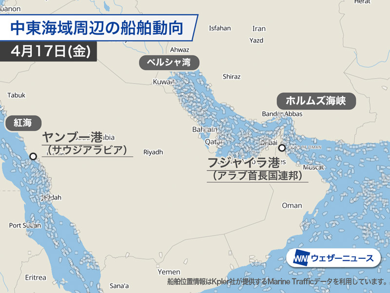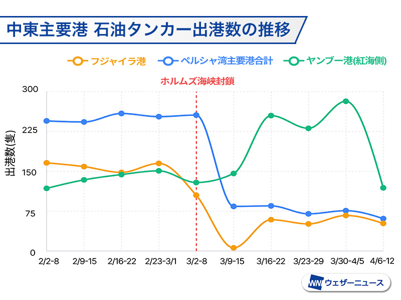 ペルシャ湾内の主要港では、2月末までは週に約240隻の出港があったものの、封鎖後では70隻〜80隻程度と、30%程度にまで激減していることが分かります。ペルシャ湾の外、オマーン湾にあるアラブ首長国連邦(UAE)最大の石油ハブ港であるフジャイラ港は、封鎖前は週平均約160隻が出港していましたが、3月第2週にはわずか6隻にまで激減しました。その後も4月第2週時点で50隻台と、封鎖前の3分の1以下にとどまっています。