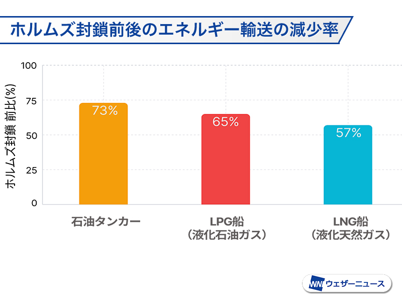 種別ごとに見ると、LNG(43%減)やLPG(35%減)の落ち込みが目立ちます。石油はパイプラインや紅海側の代替港など迂回手段がありますが、LNG(液化天然ガス)は専用ターミナルへの依存度が高く、柔軟な対応が難しいことが背景にあります。