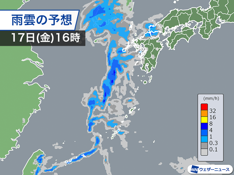 東シナ海から雨雲が近づく