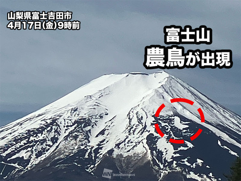 独自で観測を続けている山梨県富士吉田市は、今日17日(金)に「農鳥」の出現を発表しました。昨年より8日早く、ここ10年では最も早い観測となっています。また、過去には5月に発表されることも少なくありませんが、3年連続で4月中の発表となりました。