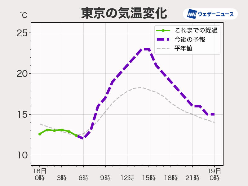 昼間は23℃前後まで気温が上がり、快適な陽気になりそうです。朝との体感変化にお気をつけください。