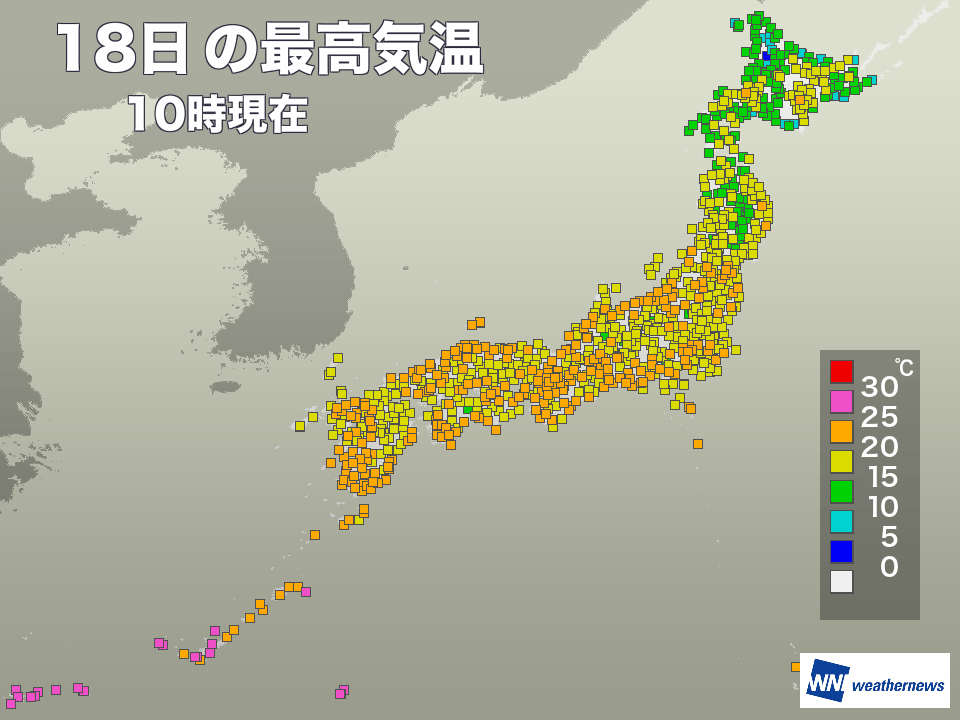 今日18日(土)は、関東から九州にかけて雲が多くなっていますが、昨日と同じくらいの気温になっています。10時の気温は、東京17.6℃、名古屋20.2℃、大阪21.1℃、広島19.4℃、福岡18.6℃でした。朝は内陸部を中心に少しヒンヤリしましたが、昼間の寒さはありません。
