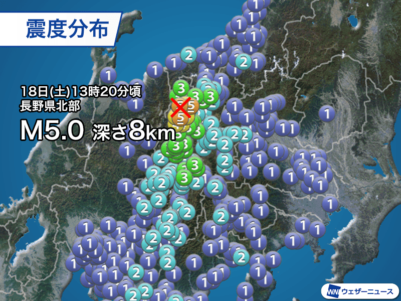 18日(土)13時20分頃、長野県北部を震源とするマグニチュード5.0、深さ8kmと推定される地震が発生しました。この地震で長野県大町市で最大震度5強、長野市で震度5弱、小川村で震度4を観測しています。