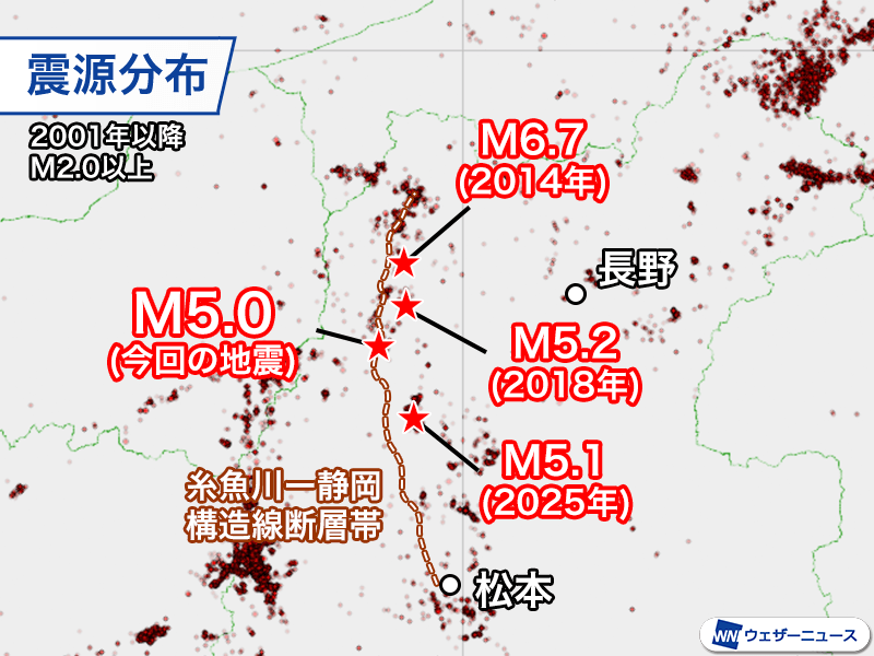 今回の震源は糸魚川ー静岡構造線断層帯の近くで、強い地震がしばしば起きている領域です。今回の震源のやや北東側では2014年11月22日にマグニチュード6.7の地震があり、最大震度6弱を観測しました。