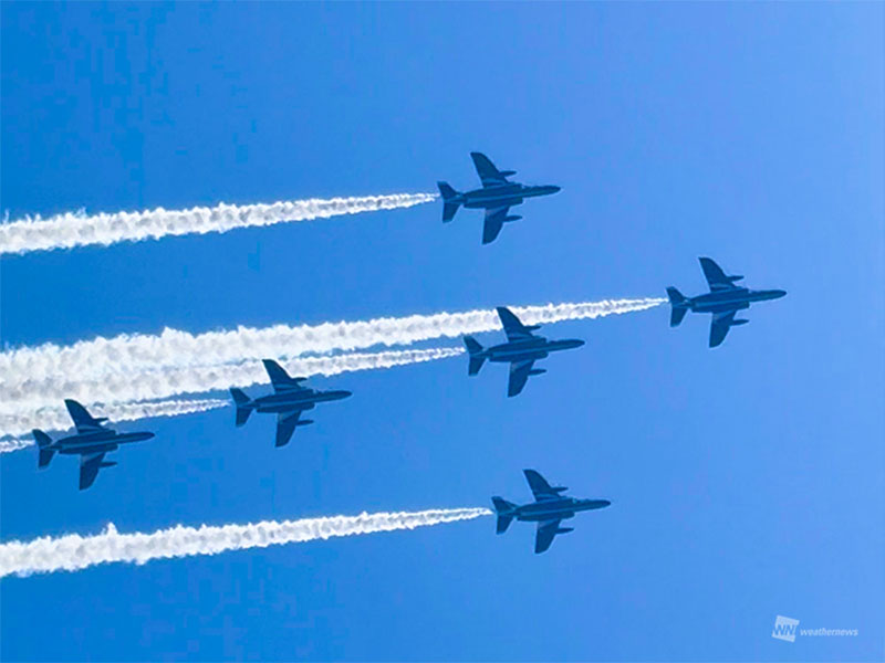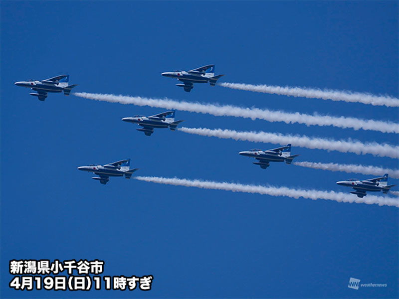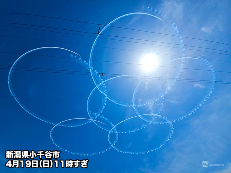 今日19日(日)、東日本では朝から晴れて、行楽日和となっています。中越地方でも薄雲がかかるところもありつつも青空が広がり、展示飛行ではブルーインパルスの白いスモークが雲に負けず青空に鮮やかに映え、美しい光景が広がりました。