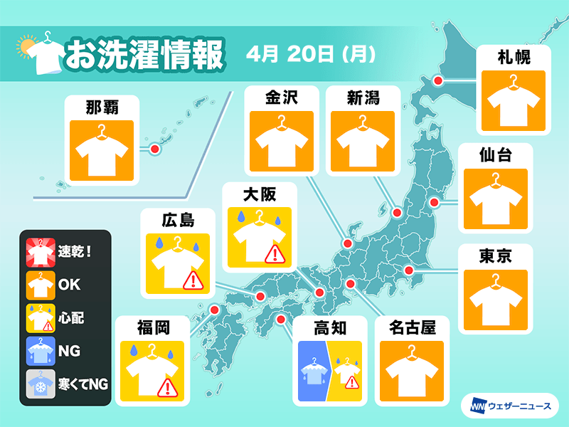 西日本は雲が広がりやすく、にわか雨の可能性があります。太平洋側を中心に雷を伴うこともあるので、部屋干しが安心です。