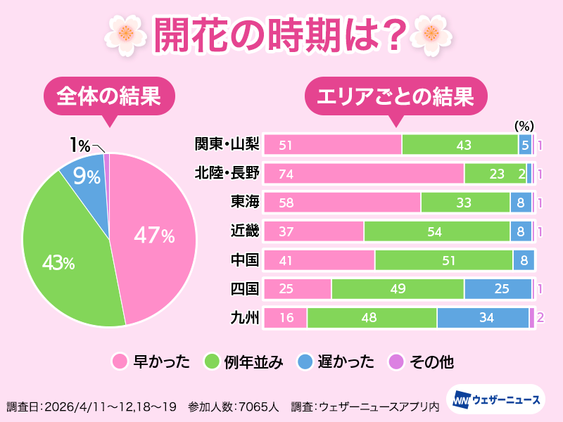 質問:「今年の桜の開花時期はどうだった?」回答項目:早かった、遅かった、例年並み、その他