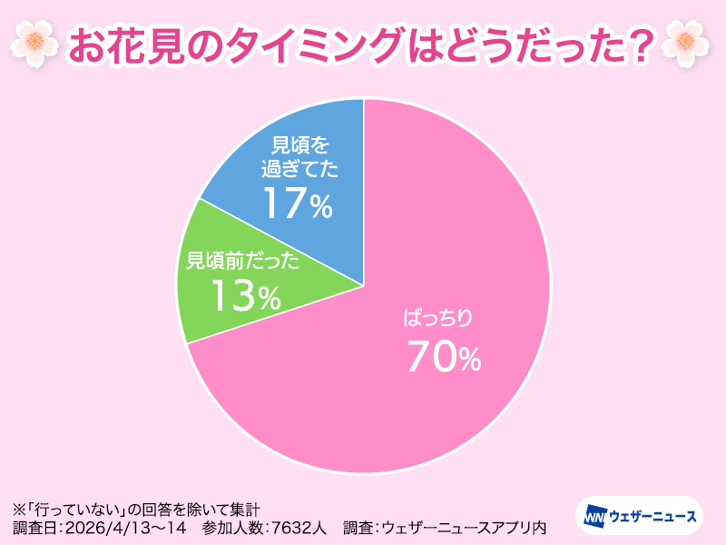 アプリの利用者に「お花見のタイミングはどうだったか」についても調査したところ、「見頃前だった」が13%、「ばっちり」が70%、「見頃を過ぎていた」が17%の結果となりました。