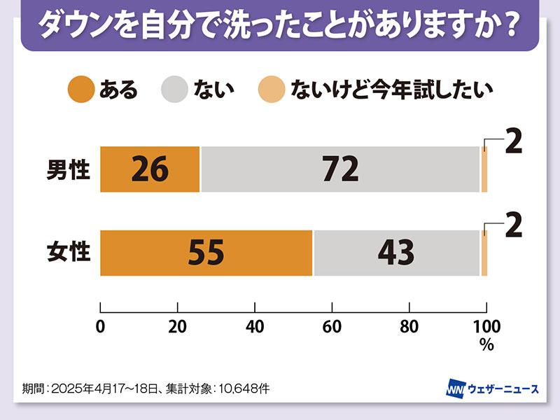 ウェザーニュースで「ダウンを自分で洗ったことがありますか?」というアンケート調査を実施したところ、「ある」と答えた人が男性は26%だった一方で、女性は半数以上の55%でした。