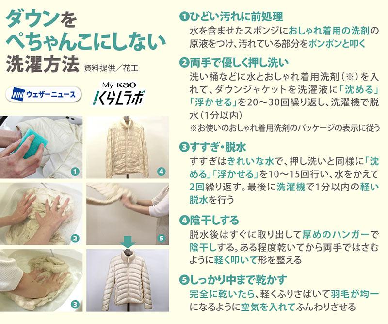 ダウンジャケットを両手で洗濯液に『沈める』『浮かせる』を20〜30回繰り返します。決してもんだりこすったりする洗い方をしないでください」(花王 コンシューマーインテリジェンス室)