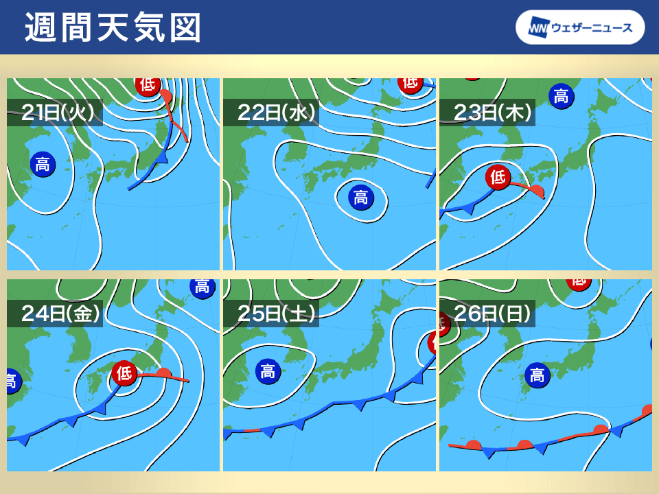 22日(水)になると移動性高気圧が通過し、北日本や東日本で晴れますが、次第に雲が厚くなっていく見込みです。西日本は雲が多く、九州では夜以降は雨が降り出す可能性があります。