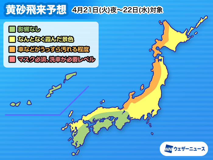 地表付近でも多少の影響が予想され、日本海側の一部ではベランダの手すりや車のボンネット等にうっすらと黄砂が付着するかもしれません。多くの地域では空が霞む程度となりますので、洗濯物の外干しは控えた方が良さそうです。