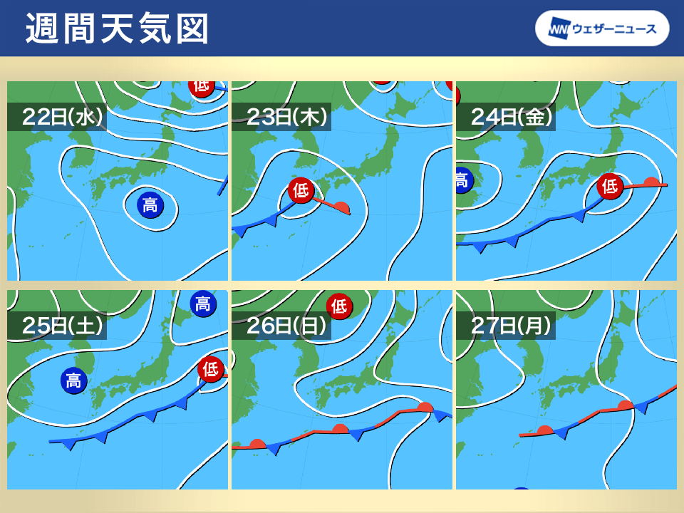 22日(水)になると移動性高気圧が通過し、北日本や東日本で晴れますが、西からは徐々に前線が接近します。西日本は雲が多く、九州では夜以降に雨の降り出す可能性があります。