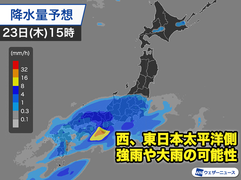 23日(木)から24日(金)にかけては、前線を伴った低気圧が本州の南岸付近を東進する見込みです。この影響で全国的に天気が崩れ、特に暖かく湿った空気が流れ込む西日本や東日本の太平洋側を中心に、雷を伴った激しい雨や大雨となるおそれがあります。沿岸部では風の強まりにも注意が必要です。