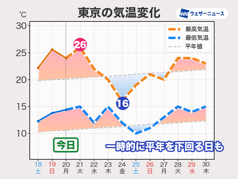 ただ、週後半はこれまでに比べると気温の上昇が抑えられる所が多くなります。久しぶりに平年よりも低くなり、少しひんやり感じるくらいになります。