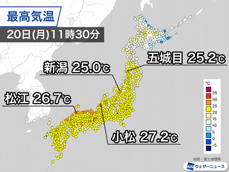 午前中から急ピッチで気温が上がっていて、山陰や近畿北部、北陸では25℃以上の所が増えてきました。11時30分までの最高気温は松江市で26.7℃、石川県小松市で27.2℃まで上昇。新潟市では25.0℃を観測し、今年初めての夏日です。