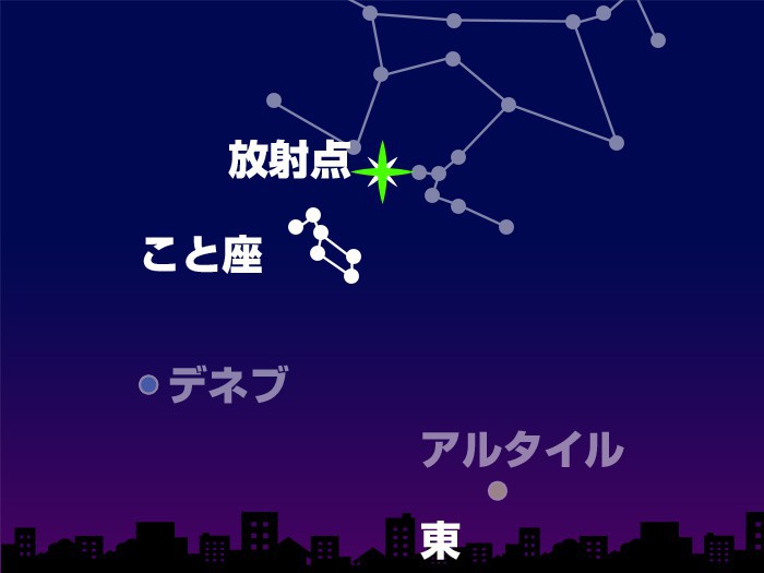 流星群の流れ星は、放射点(※)が地平線から昇ってくると出現しはじめ、放射点が空高くに昇るほど流れやすくなります。4月こと座流星群の場合だと、夜遅くの21時前後から出現が期待できます。