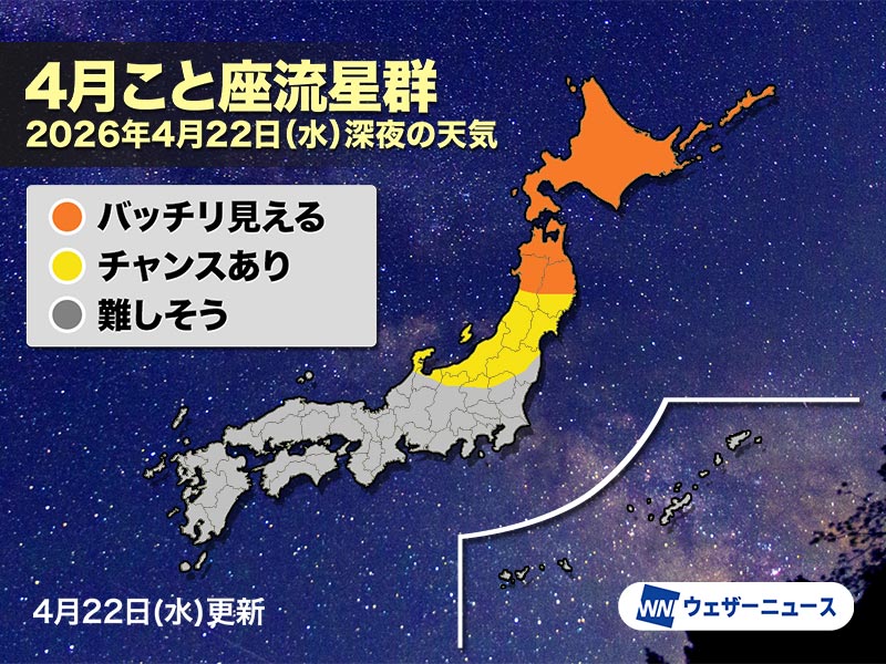 一方、北日本は晴れるところが多く、流星観測のチャンスとなりそうです!夜はこの時期らしい寒さですので暖かい格好で観賞を。