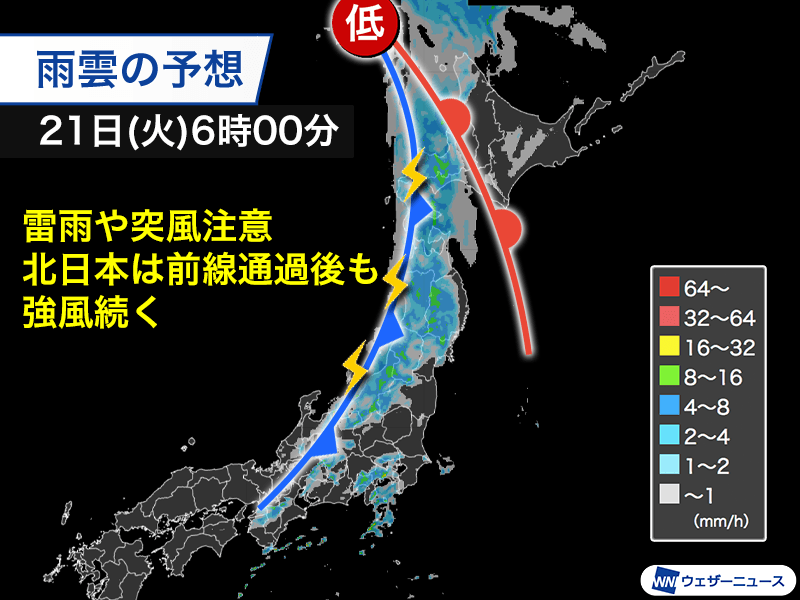 今夜から明日朝は寒冷前線が通過 雷を伴った強い雨や突風に注意