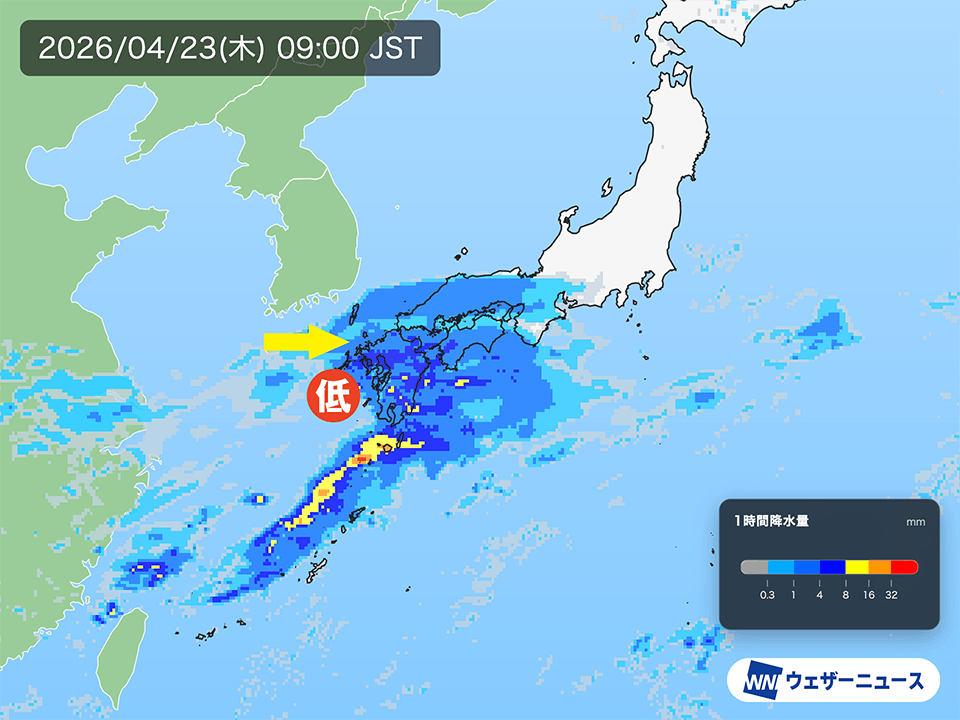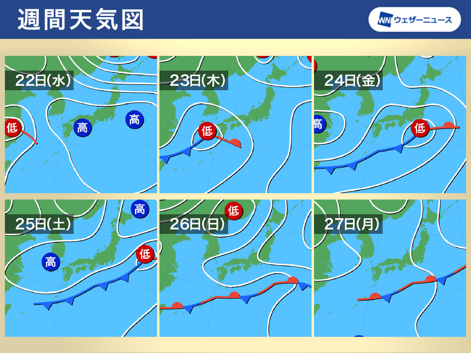 あす22日(水)は晴れる所が多いものの西から天気は下り坂で、九州では午後から雨の降りだす所がありそうです。23日(木)は低気圧の東進に伴い西日本の広範囲で朝から雨となり、東日本も次第に雨が降りだします。24日(金)は雨の残る所があるものの、各地とも回復傾向です。