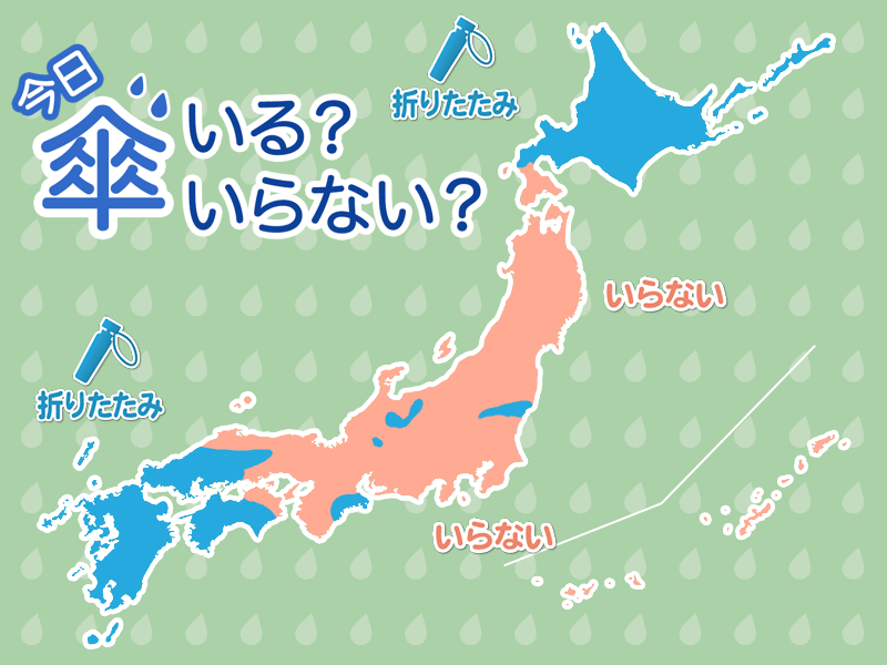 その他の地域は雨の降るところは少ないものの、北関東などではにわか雨の可能性があります。心配な方は折りたたみ傘をお持ちください。