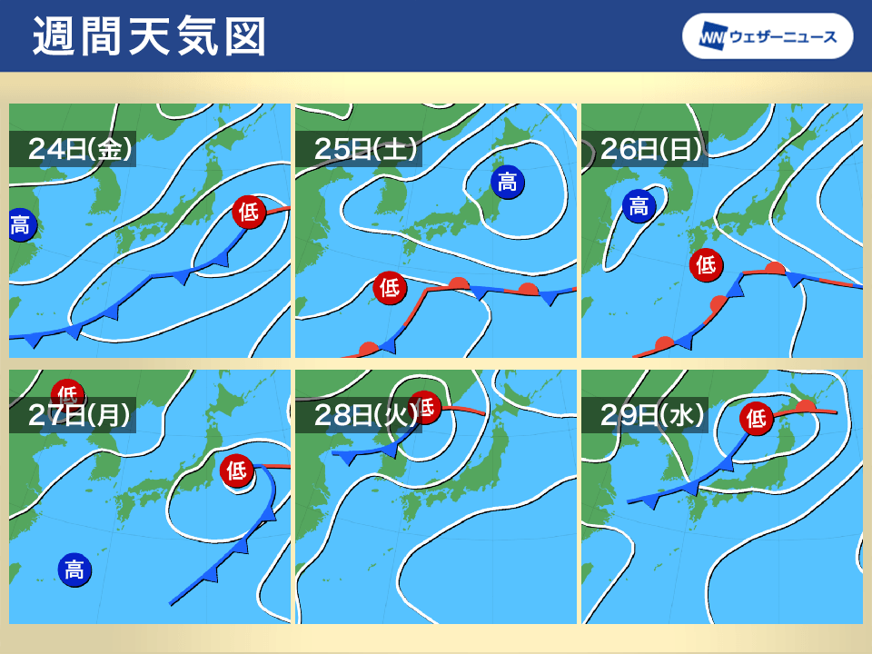 26日(日)〜27日(月)は再び前線を伴った低気圧が本州の南岸を東進し、西日本や東日本の太平洋側を中心に雨の降る所がある見込みです。