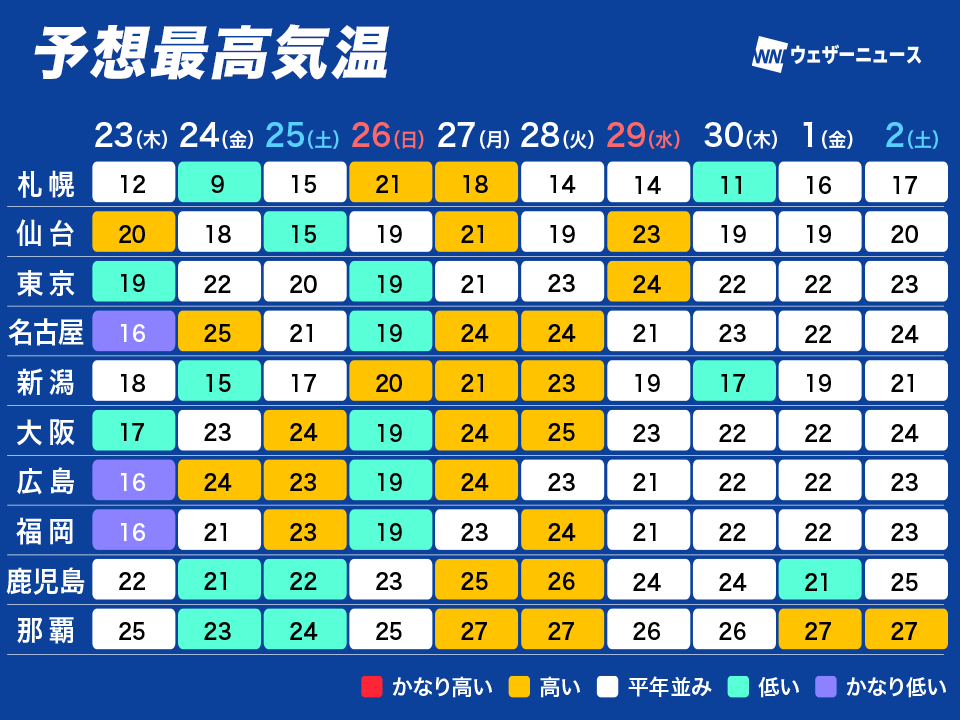 一方、24日(金)〜25日(土)や、27日(月)〜28日(火)は平年より高い見込みです。高気圧が通過して天気は回復する傾向で、名古屋市や大阪市では25℃以上の夏日になる予想になっています。一日で10℃近く気温が変化するため、体調を崩さないようお気をつけください。
