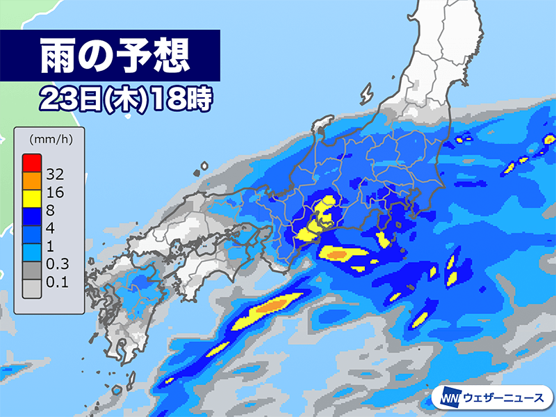 今日23日(木)の朝は、西日本の広範囲で雨がすでに降っています。また、低気圧や前線に向かって暖かく湿った空気が流れ込んでいるため、南西諸島や九州南部の太平洋沿岸部では雨雲が発達し、局地的に雨が強まっています。