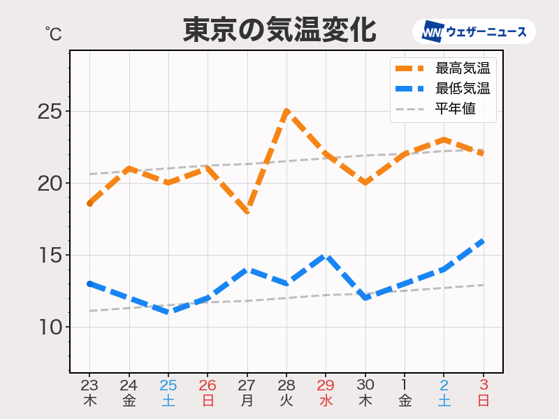 極端な暑さや寒さはないものの、日毎の気温差にも注意が必要です。