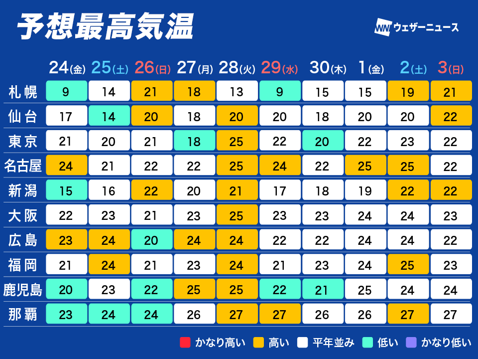 札幌では26日(日)に20℃を超える一方、明日24日(金)と29日(水・祝)は最高気温が10℃に届かない予想です。