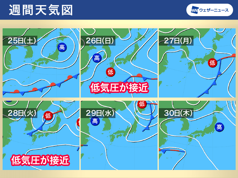 26日(日)〜27日(月)は再び前線を伴った低気圧が本州の南岸を東進し、西日本や東日本の太平洋側を中心に雨の降る所がある見込みです。低気圧や前線の近傍では強雨や雷雨の可能性もあるため注意が必要です。