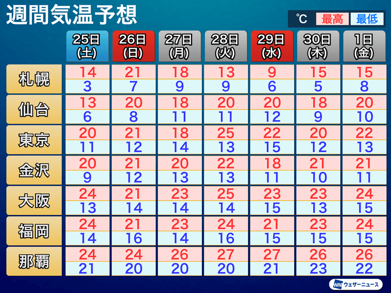 この先は寒気の影響を受ける北日本ほど日々の気温変化が大きくなります。大型連休に体調を崩さないよう、服装選びにご注意ください。