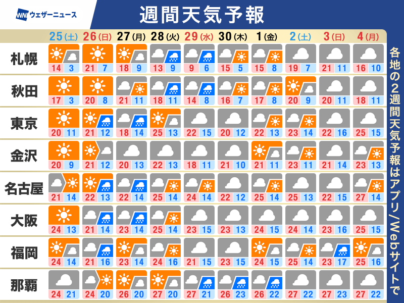 早い方だとGWの大型連休スタートとなる明日25日(土)は、西日本の太平洋側や南西諸島で雨の可能性があるものの、広範囲で晴れてお出かけ日和となりそうです。冬物のしまい洗いなど、日差しの有効活用もおすすめです。