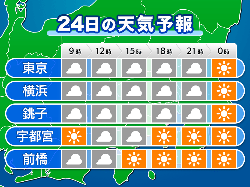 日中の最高気温は昨日より高く、東京都心で20℃、前橋や宇都宮では23℃まで上がる予想です。冷え込みはなく、過ごしやすい陽気となる見込みです。