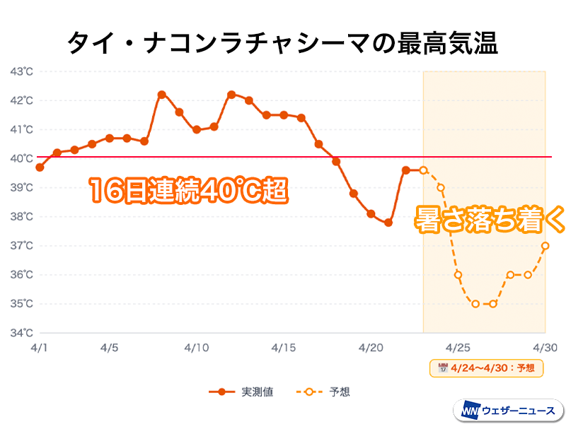 バンコクの北東に位置する内陸部のナコンラチャシーマは4月17日まで2週間以上連続で40℃を上回り、その後も39℃前後の暑さが続いています。23日(木)も最高気温は39.6℃まで上がりました。