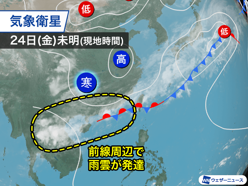 前線の北側には上空5500m付近で−9℃以下の寒気が流れ込んできたため大気の状態が不安定になり、雨雲が発達しやすくなっています。24日(金)朝の時点では中国・華南やベトナムなどで雨雲が発達し、タイの一部にも活発な雨雲がみられる状況です。