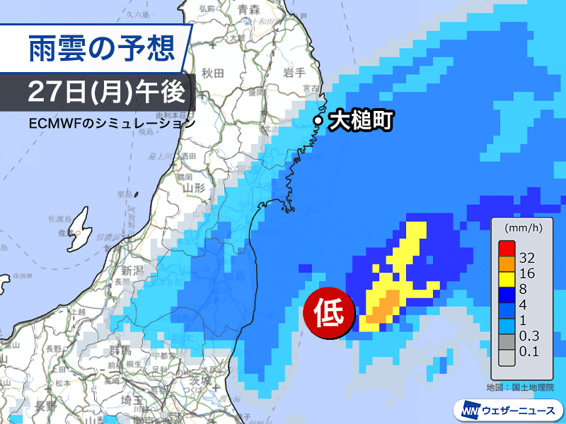 27日(月)は低気圧が関東沖から三陸沖へと進むため雲が広がり、一時的に雨の降る可能性があります。また、28日(火)も低気圧や前線が通過する予想で、大槌町周辺も雨が降る予想です。