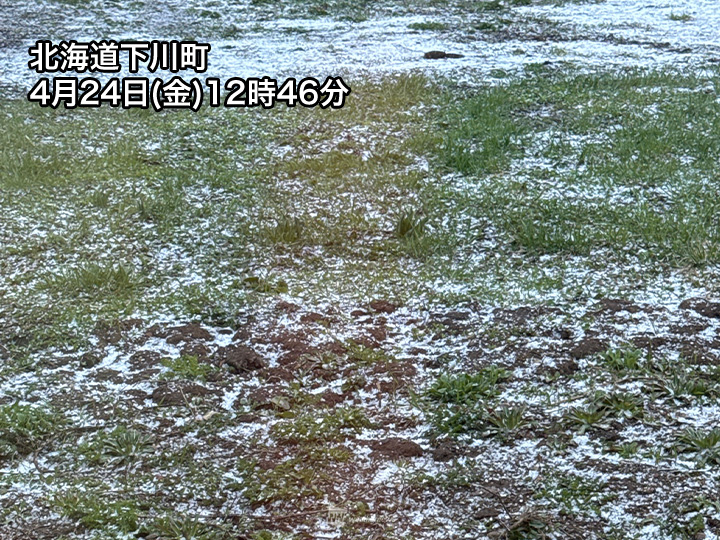 一つ一つの雨雲はそれほど大きくはないものの活発なものが含まれていて、一部では雨に加えて霰や雹も降っています。内陸部の下川町では霰によって地面がうっすらと白くなるほどです。