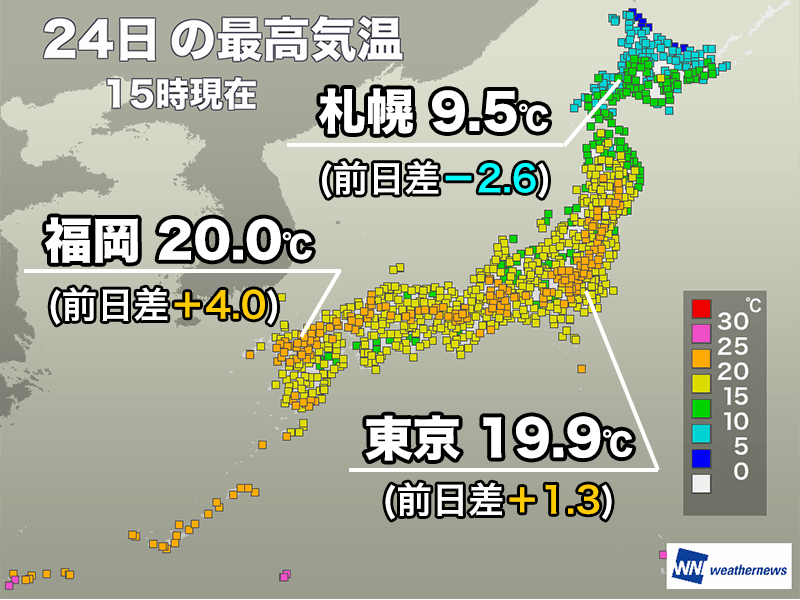 穏やかに晴れた東北も含め、最高気温は20℃前後まで上がりました。福岡市は昨日に比べて4.0℃高い20.0℃、名古屋市は4.1℃高い21.2℃、東京都心は1.3℃高い19.9℃です。東北も内陸部を中心に気温が上昇し、朝は4.4℃まで冷え込んだ盛岡市は19.4℃と5月中旬並みの陽気になっています。