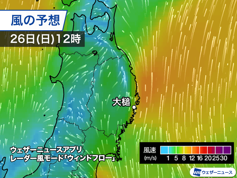 明日26日(日)は高気圧の中心が東に離れ、日本海に低気圧が進んでくることで東西の気圧差が今日に比べると大きくなります。