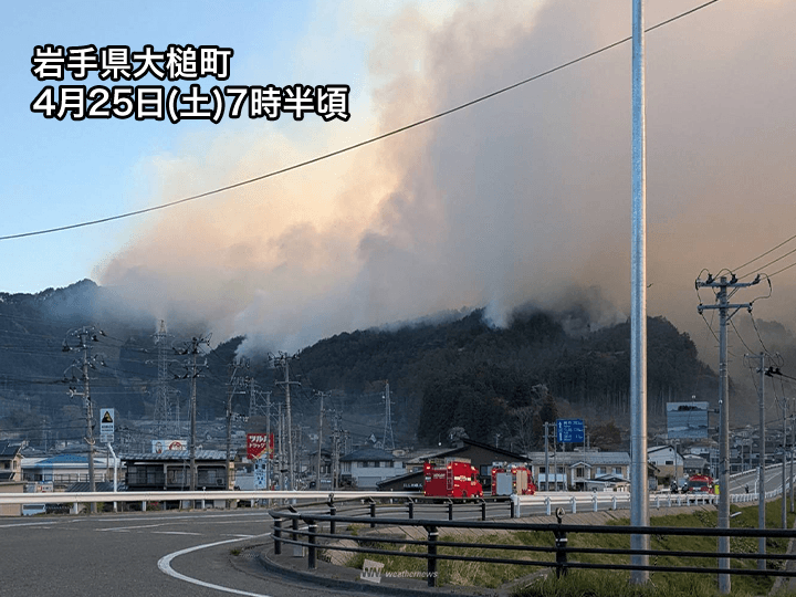山林火災による延焼が続いている岩手県大槌町は今日25日(土)も晴天が続き、雨は期待できません。明日26日(日)は一時的に風の強まるタイミングがあり、延焼の拡大が心配されます。