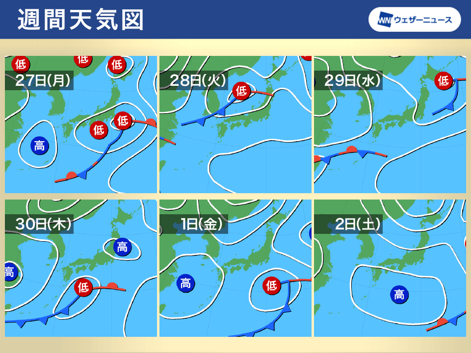 明日27日(月)は東日本で雨の週明け