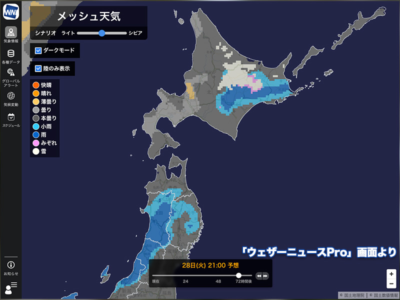 28日(火)は低気圧が北日本を、前線が東日本を通過する影響で、広く雨が降る予想です。低気圧や前線に近いエリアでは、雨の強まりに注意が必要です。