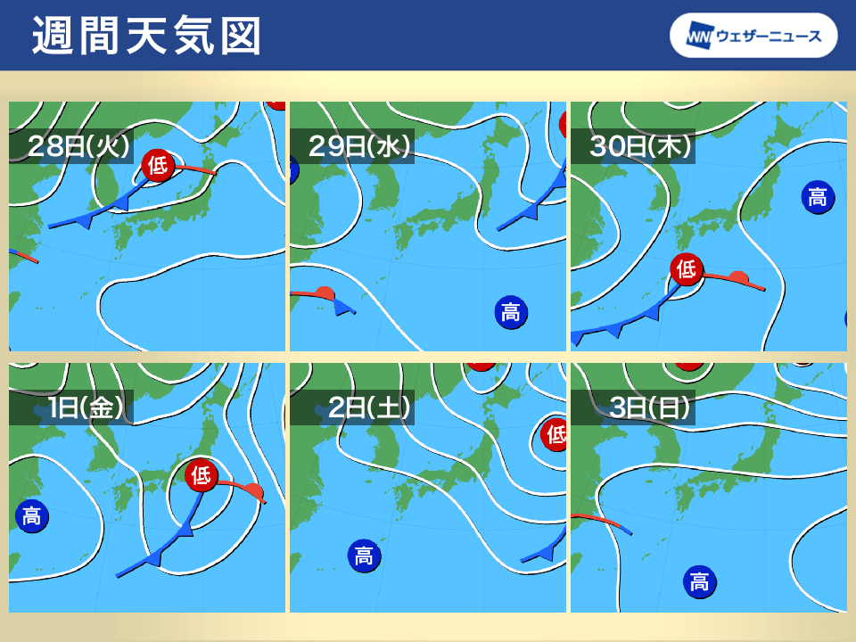 28日(火)は低気圧が北日本を進み、前線が東日本付近を通過します。低気圧や前線に近いエリアでは、一時的に雨の強まる可能性があります。