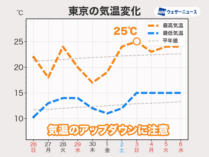 来週は日毎の気温変化に注目です。朝晩と昼間の体感差も大きくなるため、お出かけの際は脱ぎ着しやすい服装で調節するのがおすすめです。