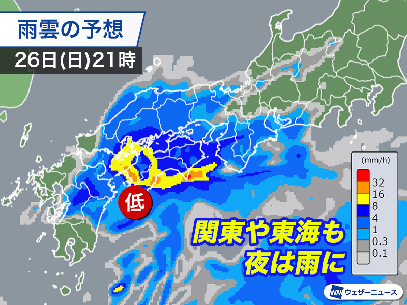 雨雲は段々と東に広がり、午後は近畿でも雨が降り始めます。関東や東海も次第に雲が厚みを増し、東海では夕方以降は雨が降り出す見込みです。関東でも夜遅くから雨となるため、帰宅が遅い方ほど注意が必要です。