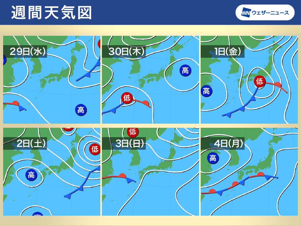 30日(木)から1日(金)は低気圧が本州の南海上を進み、広い範囲で天気が崩れる見込みです。低気圧の周辺では雨や風の強まるおそれがあり、注意が必要です。