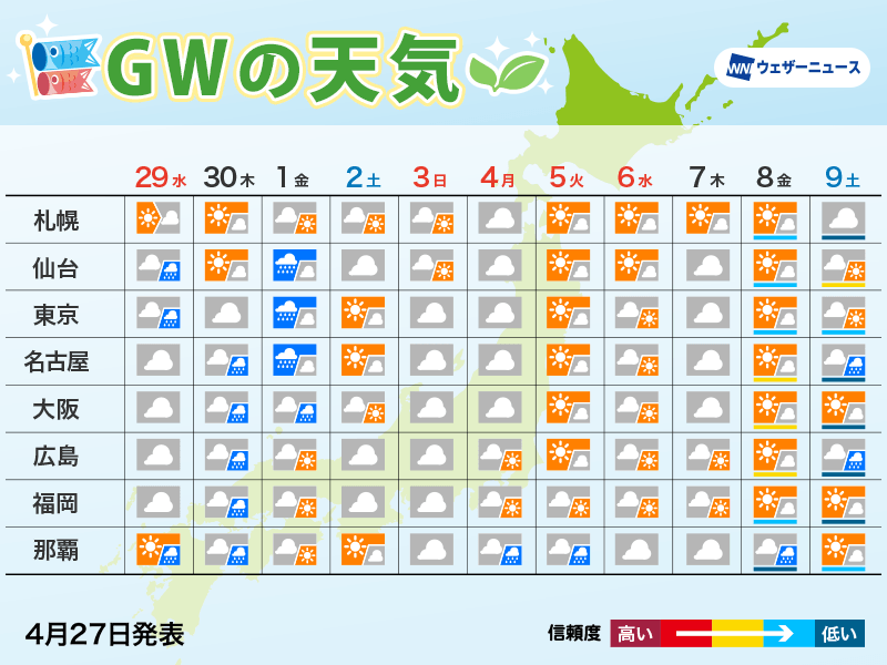 その後、5月5日(火)・こどもの日から6日(水)・振替休日は前線が離れ、日差しの届くところが多くなりそうです。