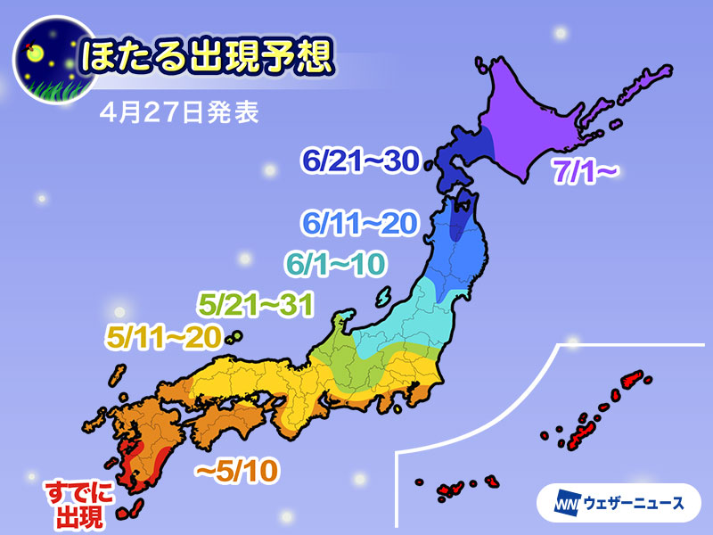 この先は気温が平年並みに戻る予想で、蛍前線の北上にどのような影響があるか注目されます。